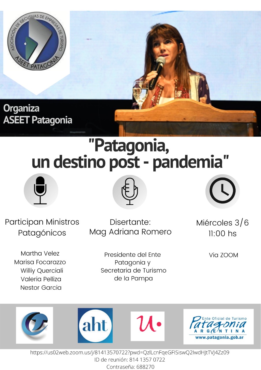 “Patagonia, un destino post-pandemia” será la temática de la disertación que estará a cargo de la Presidente del Ente Patagonia y Secretaria de Turismo de La Pampa, Adriana Romero, con la participación de los titulares de las carteras turísticas de todas las provincias de la región, y tendrá lugar el miércoles 3 de junio a las 11hs a través de la plataforma Zoom.